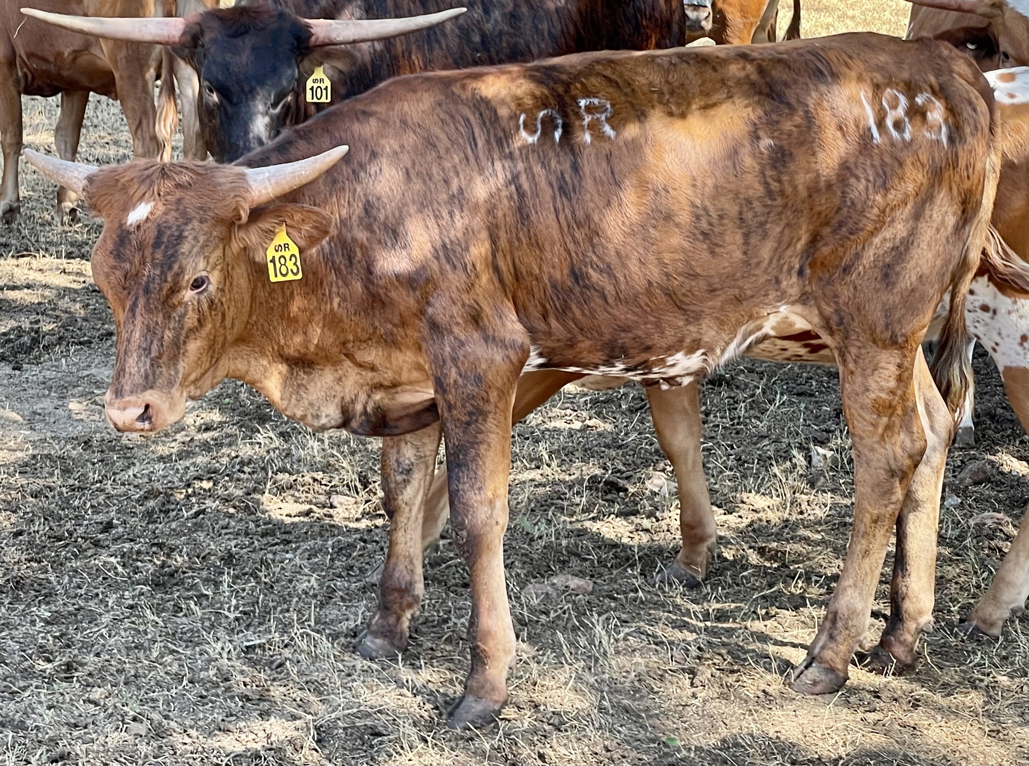 We purchased her from Struthoff Ranch in the spring of 2024. She is a beautiful brindle cow built like a Mack truck (look at that hip!). She is out of one of our biggest cows KDK Tomboy's Phoenix and sired by the ever popular KDK Wildfire.