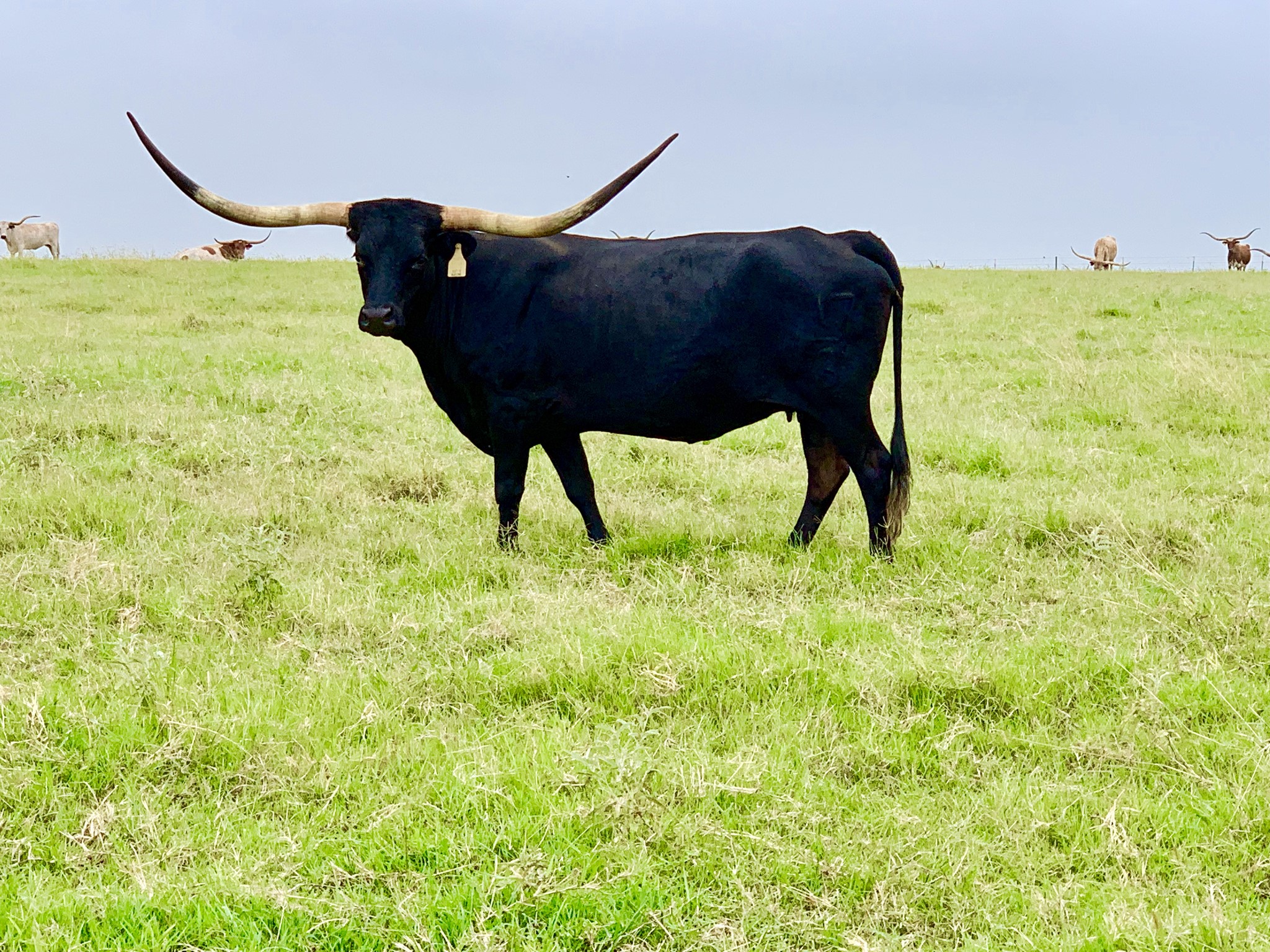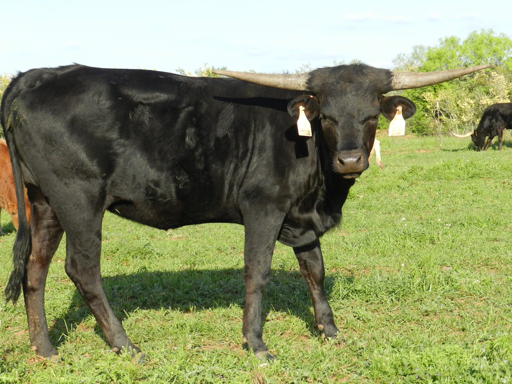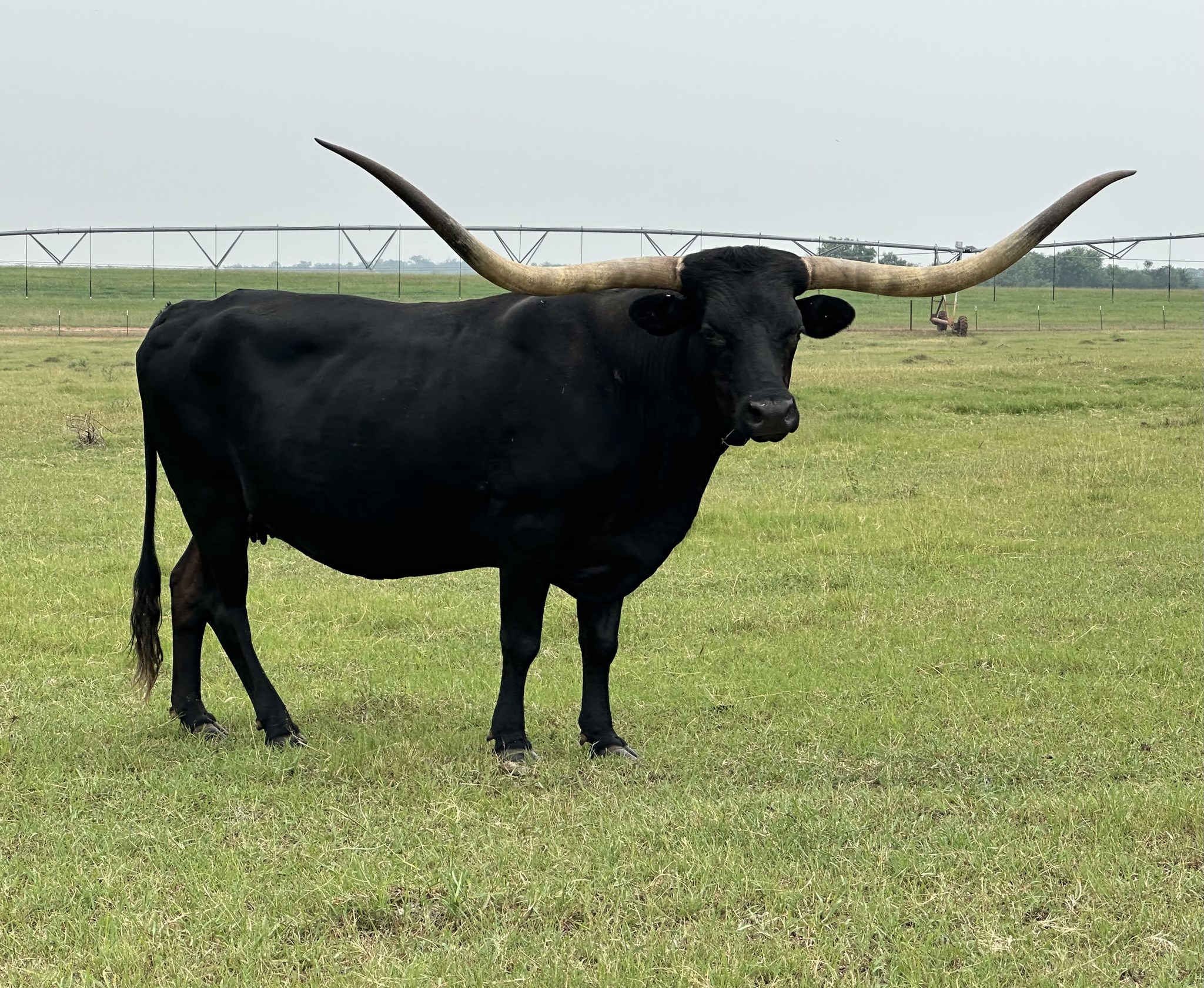 We purchased her from Rockin I Longhorns in the Summer of 2024. She is well-built cow with a solid black coat. She should be crossing the 90" TTT mark the next time we measure her!