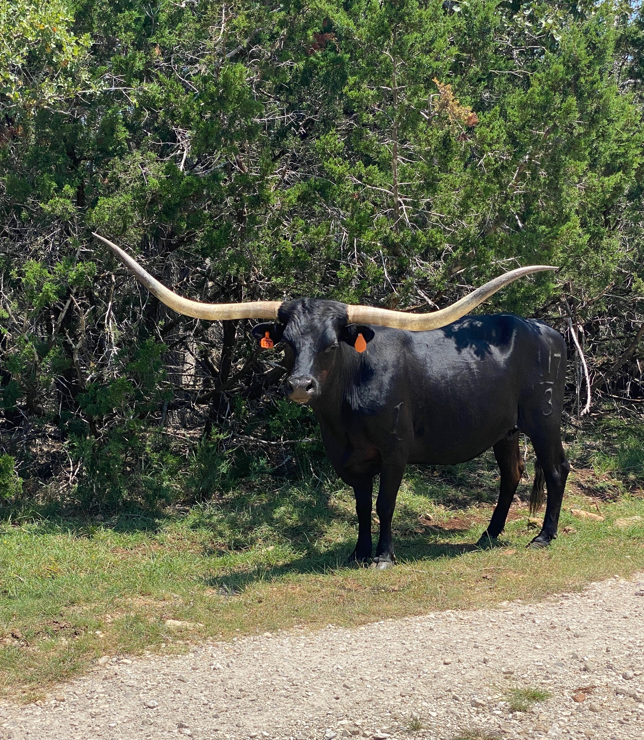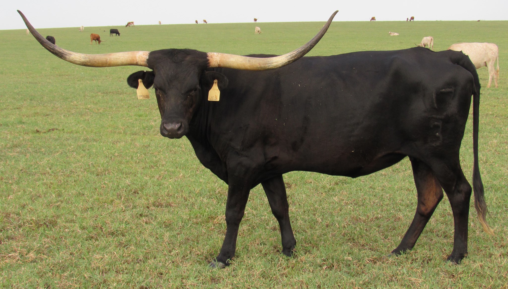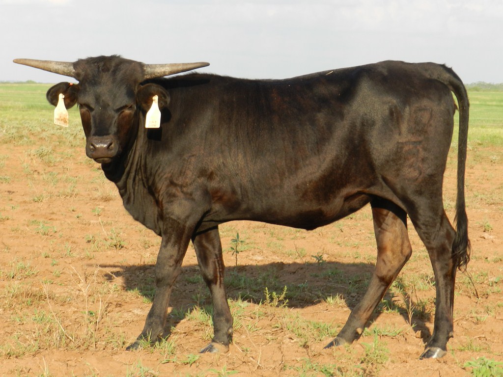 We purchased her from Rockin I Longhorns in the Summer of 2024. She is well-built cow with a solid black coat. She should be crossing the 90" TTT mark the next time we measure her!